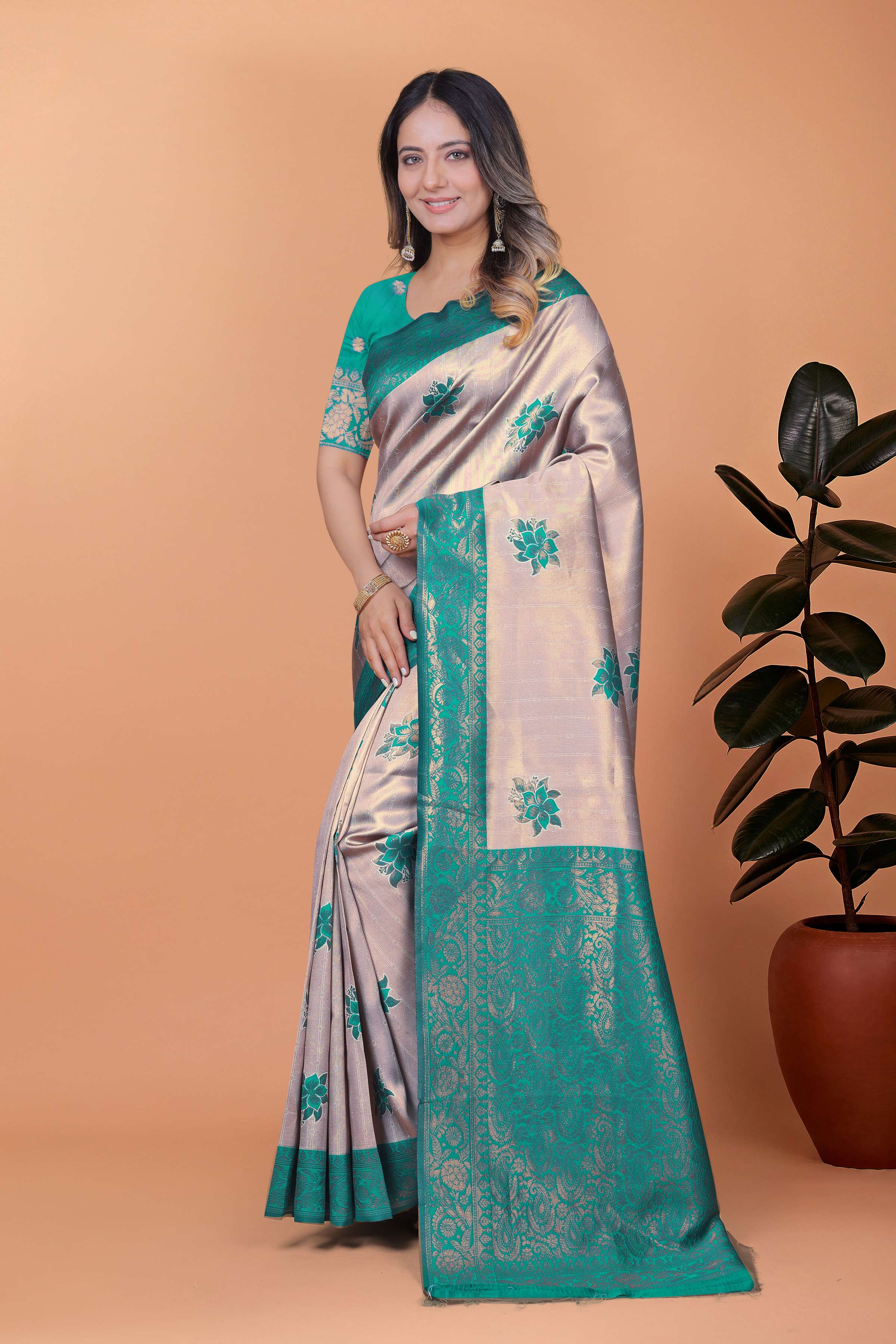 Celestial Grace Mint Green Banarasi Silk Saree with Royal Blue & Copper Zari Work | Wedding, Reception & Festival Wear
